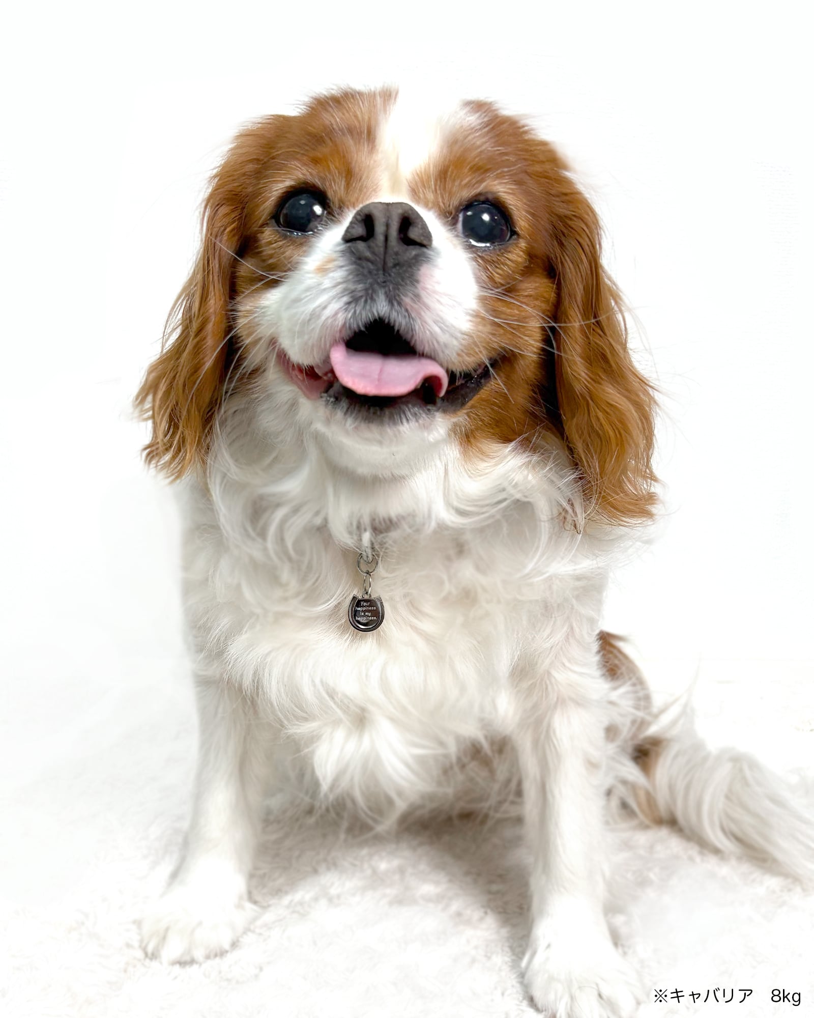 首輪やハーネスの金具パーツなどに取り付けれます。