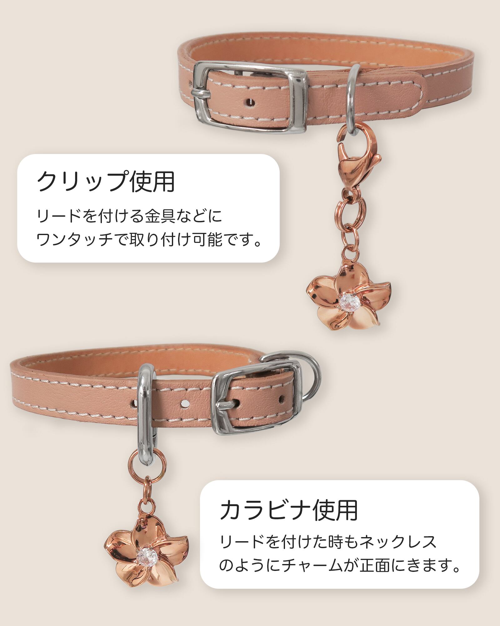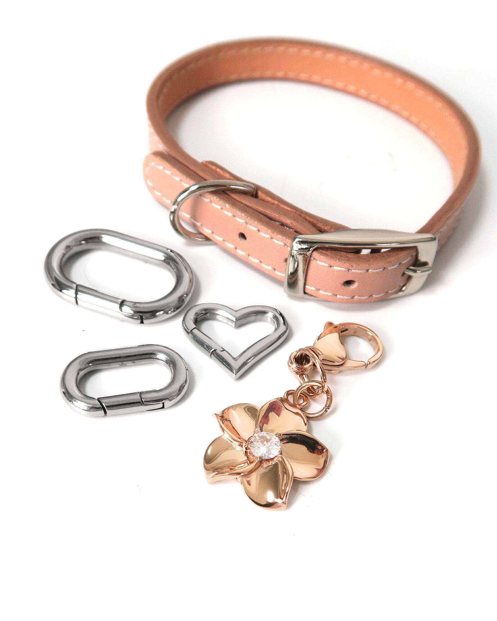 首輪やハーネスの金具パーツなどに取り付けれます。