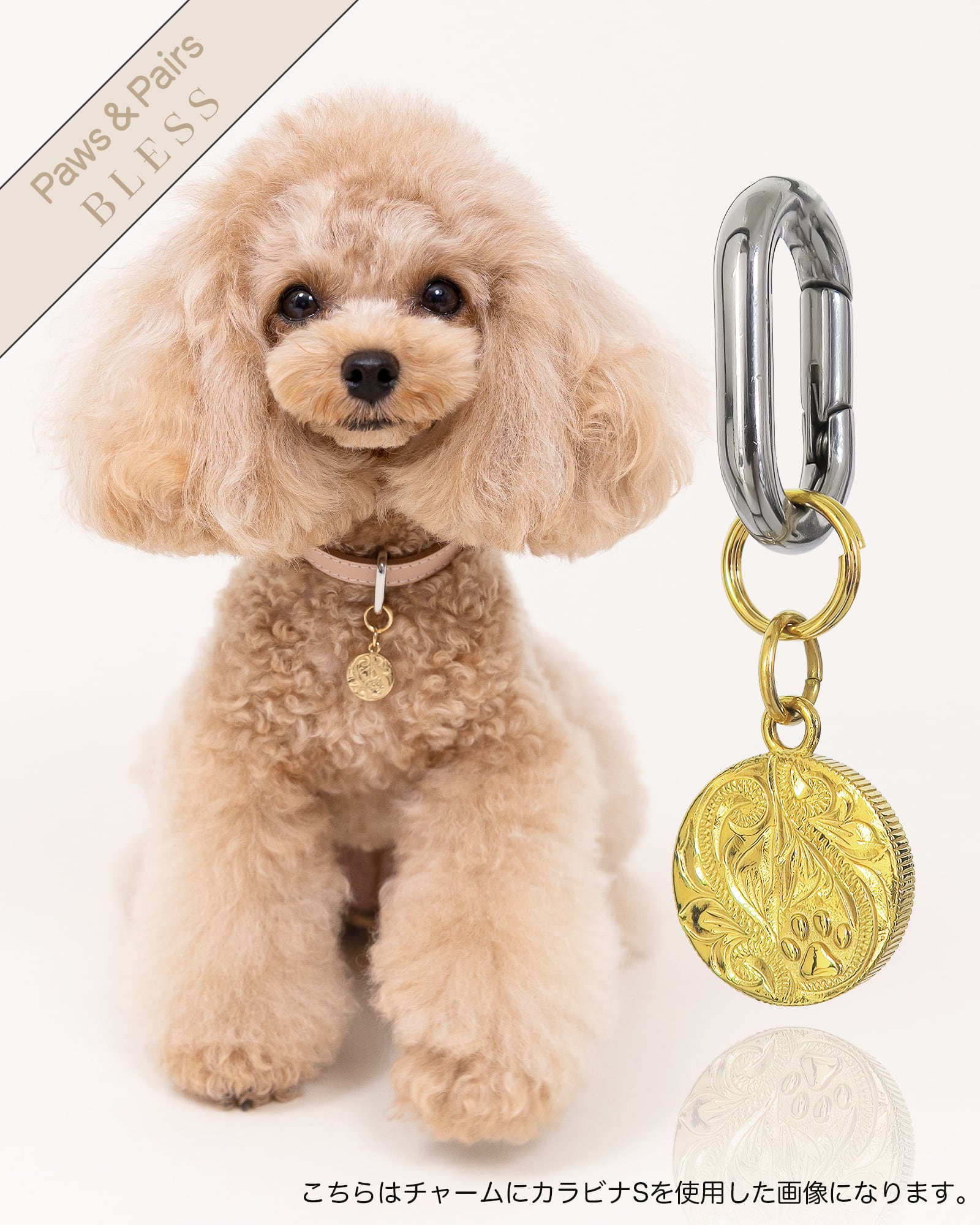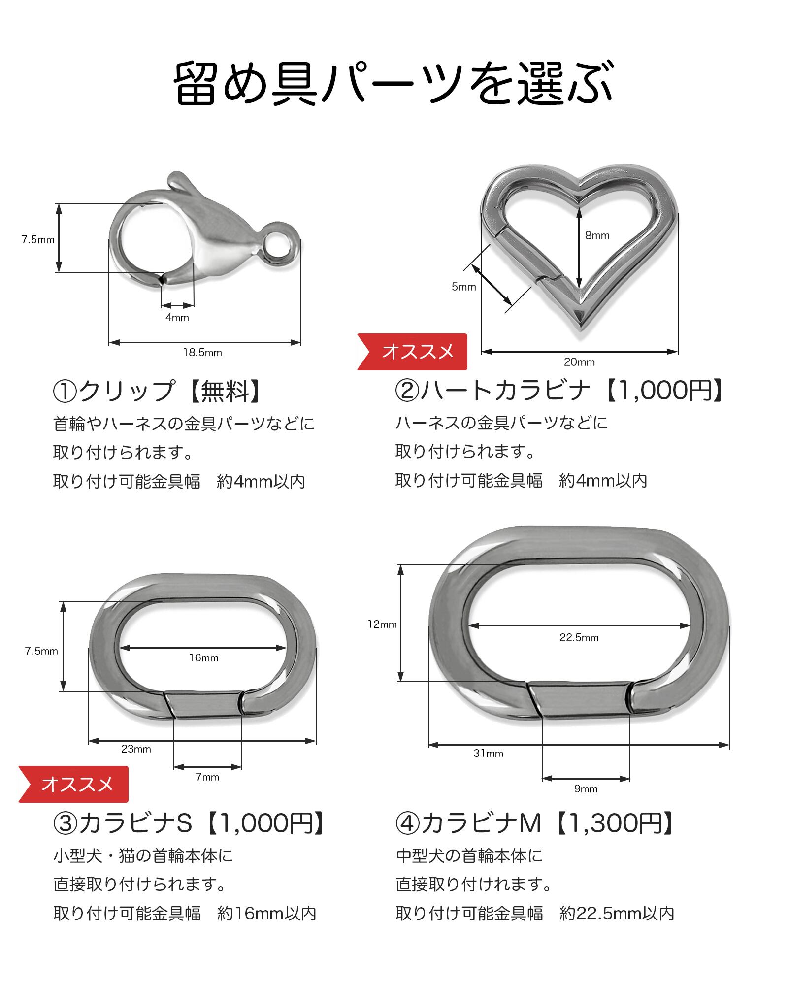 首輪やハーネスの金具パーツなどに取り付けれます。